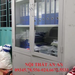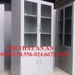Tủ sắt đựng tài liệu văn phòng 4 cánh mở chia làm 3 khoang riêng biệt. Khoang bên trên có 2 cánh kính mở, bên trong có 2 đợt cố định chia làm 3 ngăn đều nhau. Chiều cao mỗi ngăn 38 cm vừa đủ để đựng file tài liệu, hồ sơ.